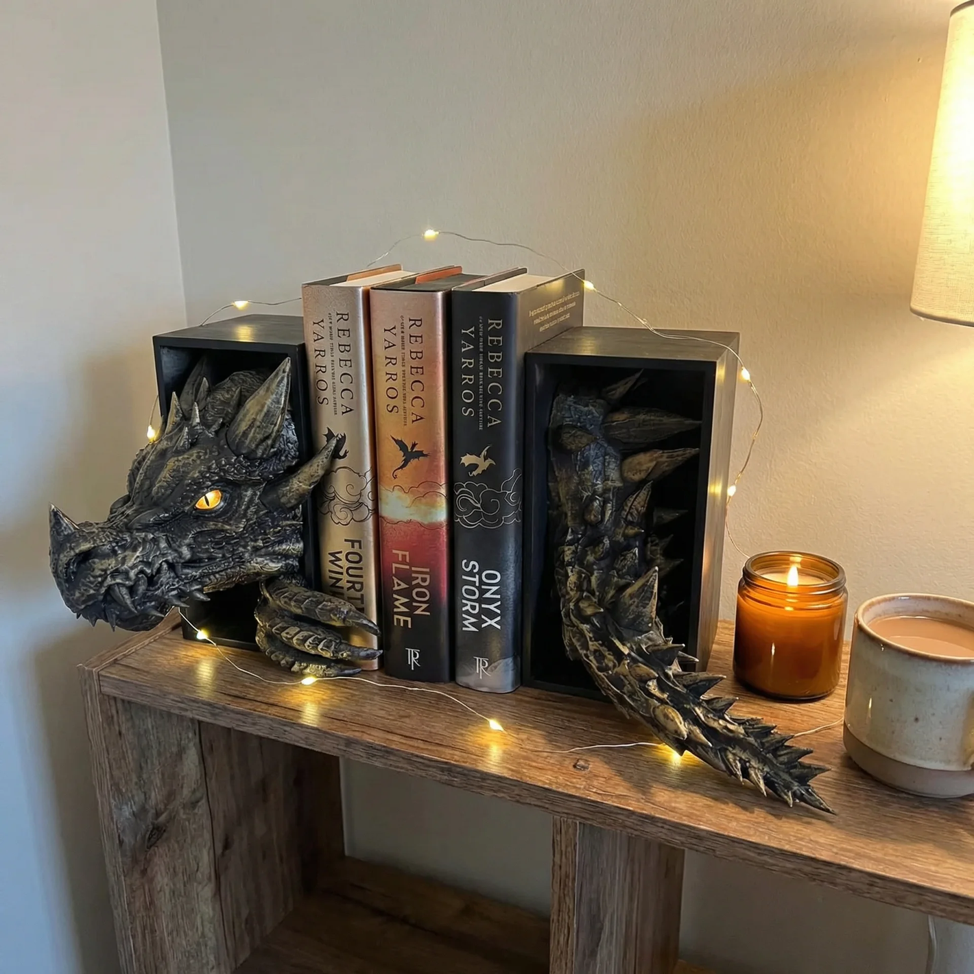 Each dragon book nook is hand-carved from sustainably sourced wood and finished with a protective resin coating that brings out the scale detail and gives it a lasting durability. The resin seal also protects against moisture and everyday wear.